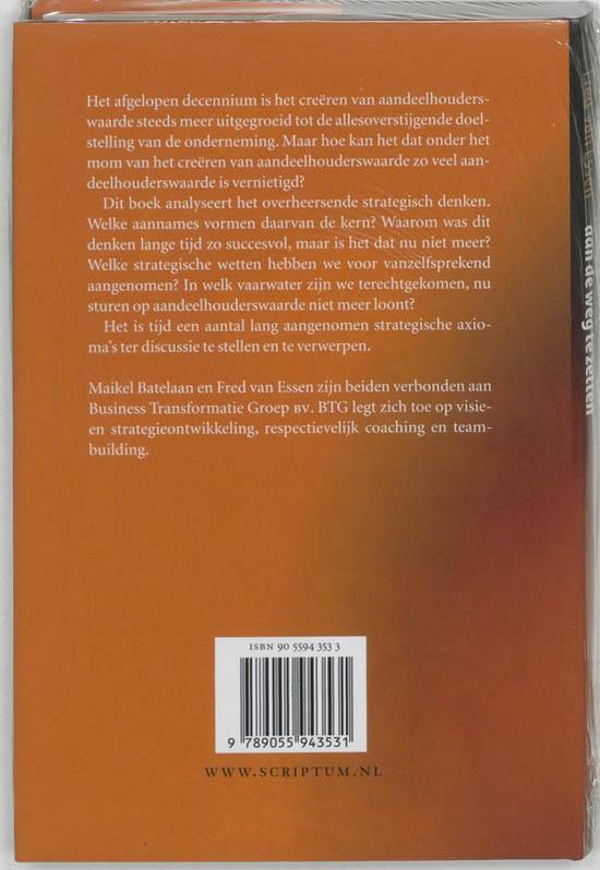 Het afgelopen decennium is het creëren van aandeelhouderswaarde steeds meer uitgegroeid tot de allesoverstijgende doelstelling van de onderneming. Maar hoe kan het dat onder het mom van het creëren van aandeelhouderswaarde zo veel aandeelhouderswaarde is vernietigd? Dit boek analyseert het overheersende strategische denken. Welke aannames vormen daarvan de kern? Waarom was dit denken lange tijd zo succesvol, maar is het dat nu niet meer?