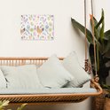 Een patroon vol met illustraties van kippen en versierde paaseieren, omringd door kleine bloemetjes en takjes. De pastelkleuren en speelse stijl geven een gezellige en landelijke uitstraling..