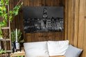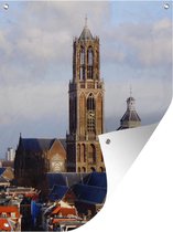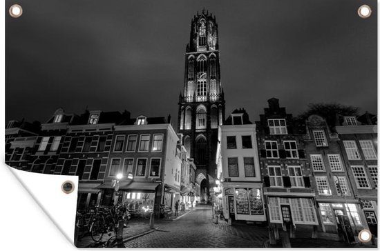 Tuinposter 120x80 cm - Tuindecoratie Verlichte Domtoren van Utrecht - zwart wit - Poster voor in de tuin - Buiten decoratie - Schutting tuinschilderij - Tuindoek muurdecoratie - Wanddecoratie balkondoek