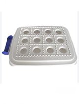 - Verwijder indien nodig het overtollige deeg aan de zijkanten met behulp van het lepeltje. Druk daarna harder met de Deegrol om de ravioli uit de vormen te halen.