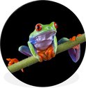 Een kikker op bamboe. Het dier is te zien op een zwarte achtergrond..