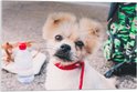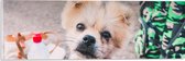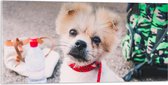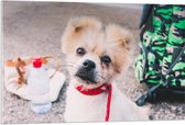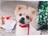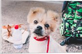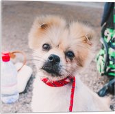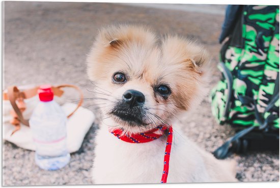 WallClassics - Acrylglas - Puppy met Rood Halsbandje Kijkend in Camera - 75x50 cm Foto op Acrylglas (Wanddecoratie op Acrylaat)