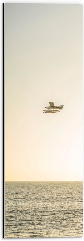 WallClassics - Dibond - Vliegtuig Vliegend boven Water met Boeien bij Lichtkleurige Lucht - 20x60 cm Foto op Aluminium (Met Ophangsysteem)