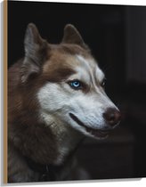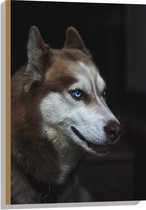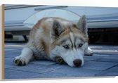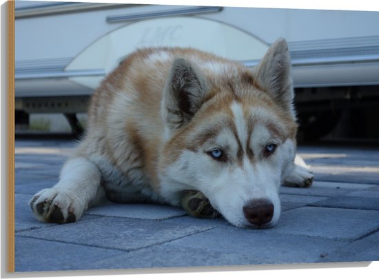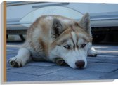 WallClassics - Hout - Liggende Bruine Husky op Stenen - 100x75 cm - 9 mm dik - Foto op Hout (Met Ophangsysteem)