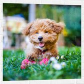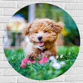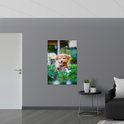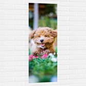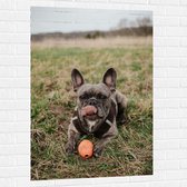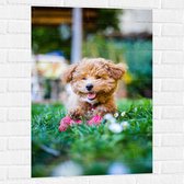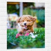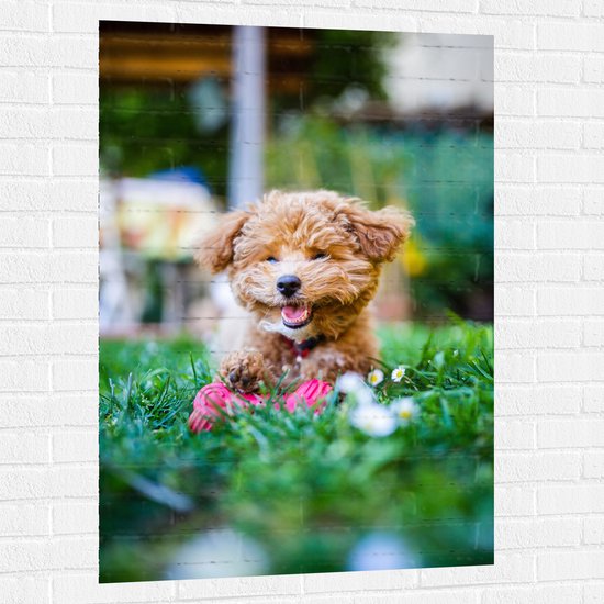 WallClassics - Muursticker - Bruine Hond Spelend in het Gras - 80x120 cm Foto op Muursticker