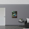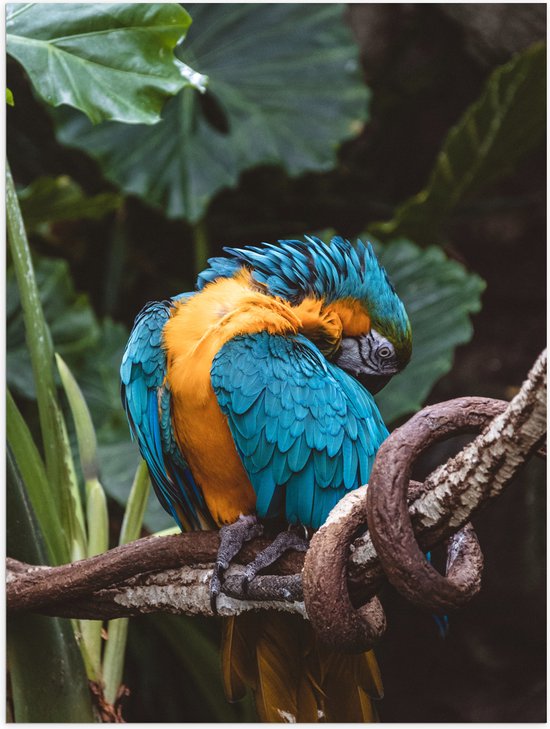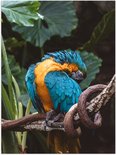 WallClassics - Poster Glanzend – Gekke Papegaai op een Tak - 60x80 cm Foto op Posterpapier met Glanzende Afwerking