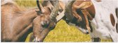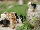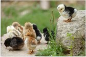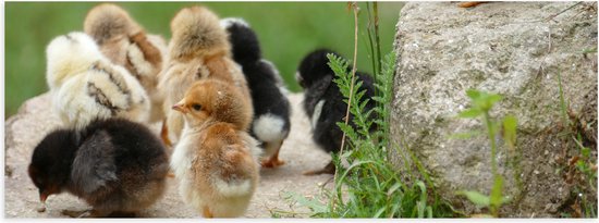 WallClassics - Poster Glanzend – Groepje Kuikentjes buiten - 90x30 cm Foto op Posterpapier met Glanzende Afwerking