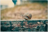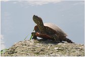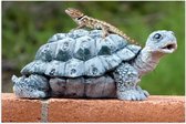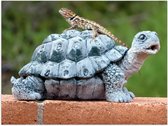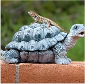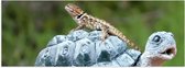 WallClassics - Poster Glanzend – Hagedis op een Stenen Schildpad - 60x40 cm Foto op Posterpapier met Glanzende Afwerking