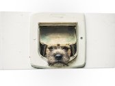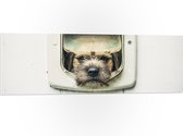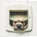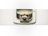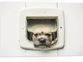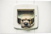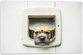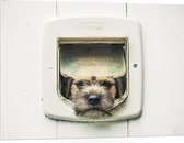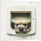 WallClassics - PVC Schuimplaat - Hond kijkend door Huisdierklep - Borderterriër - 80x80 cm Foto op PVC Schuimplaat (Met Ophangsysteem)