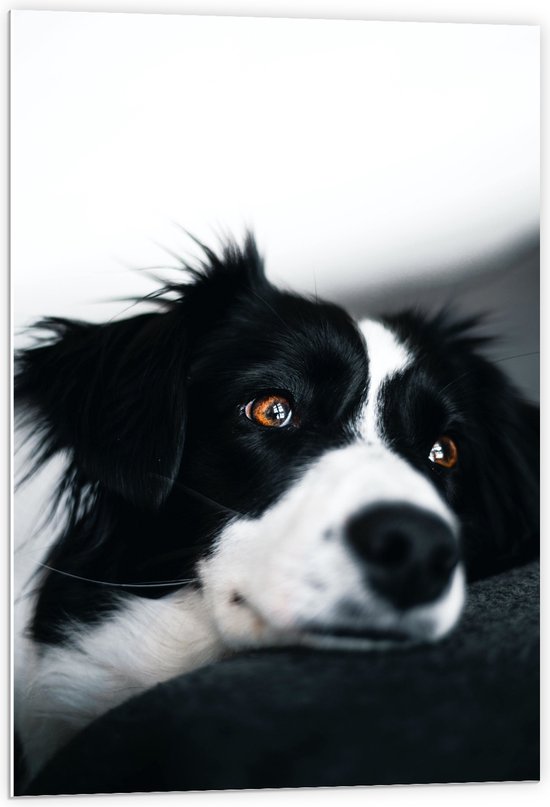 WallClassics - PVC Schuimplaat - Zwart/Witte Hond op de Bank - 60x90 cm Foto op PVC Schuimplaat (Met Ophangsysteem)