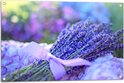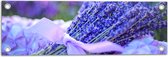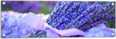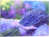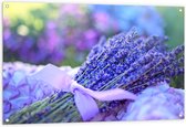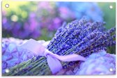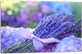 WallClassics - Tuinposter – Setje Lavendeltakken met Strik - 90x60 cm Foto op Tuinposter (wanddecoratie voor buiten en binnen)