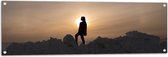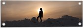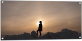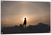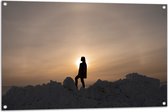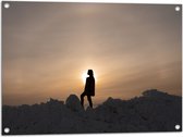 WallClassics - Tuinposter – Vrouw Poserend op Hoop Sneeuw - 105x70 cm Foto op Tuinposter (wanddecoratie voor buiten en binnen)