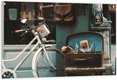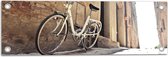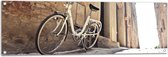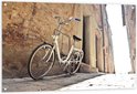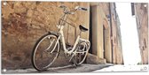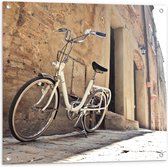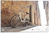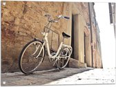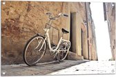 WallClassics - Tuinposter – Witte Fiets geparkeerd in Steegje - 120x80 cm Foto op Tuinposter (wanddecoratie voor buiten en binnen)