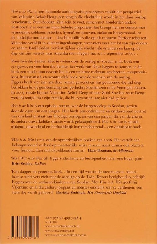 Dave Eggers heeft met dit boek misschien wel een nieuw genre geïntroduceerd, namelijk een soort tussenvorm tussen een journalistiek portret en een roman. Het eerste omdat hij de waargebeurde levensgeschiedenis van Achak (die gebroederlijk naast Dave Eggers of de achterkaft staat afgebeeld) optekent, maar ook dat tweede: omdat hij ook een literaire touch geeft aan het verhaal: bijvoorbeeld doordat hij Achak zijn Soedanese belevenissen steeds laat vertellen aan personen die hij, als hij al in Amerika is, om wat voor reden dan ook tegenkomt. Zo richt Achak zich achtereenvolgens naar het zoontje van de man die hem gijzelt in zijn Amerikaanse flatje (bizar maar waar), de ziekenhuismedewerker die hem negen uur op een behandeling laat wachten, de bezoeker van de sportschool waar hij werkt, etc. Eggers brengt hiermee prachtig naar voren dat Achak een absolute noodzaak voelt zijn verhaal te vertellen. Hiermee is 'Wat is de wat' een zeldzaam urgent boek geworden: een boek dat geschreven moét worden, een verhaal wat gehoord moét worden. Gecombineerd met de fantastische wijze waarop Eggers het verhaal vertelt, is het vooral hierdoor nu al een absolute klassieker geworden. Maar één tip dus: lezen!