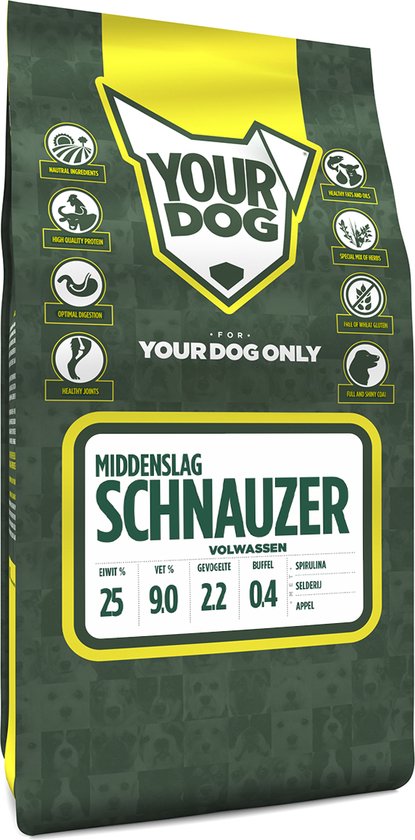 Yourdog Middenslag schnauzer HondenvoerYourdog Middenslag schnauzer zorgt voor de holistische gezondheid en het welzijn van jouw hond. Alle Yourdog varianten bevatten smaakvolle buffel en kip. Wij combineren dit met zorgvuldig geselecteerde groenten, fruit en kruiden om zo te komen tot de perfecte voeding voor jouw Middenslag schnauzer.Waarom Yourdog Middenslag schnauzer Rijk aan buffel en gevogelteSpeciaal gemaakt voor de Middenslag schnauzerBevat Spirulina, Selderij en AppelBevordert een gezonde, glanzende vachtBehoud een gezonde darmfloraVrij van kunstmatige geur-, kleur- of smaakstoffenOok geschikt voor de gevoelige Middenslag schnauzerOnze ingrediëntenVoor het maken van ons voer wordt er voor een 12 kg-zak 10,6 kg vlees ingedroogd, zodat dit beter te verwerken is in onze brok. Met de juiste hoeveelheid groente, fruit en kruiden is Yourdog een gezonde, voedzame keuze voor de hond.BuffelBij Yourdog gebruiken wij vlees van vrij opgegroeide en gras gevoerde buffels. Buffelvlees staat bekend om zijn romige, frisse smaak en rijke kleur en zit vol met vitaminen en mineralen. Met een lager cholesterol- en vetgehalte en minder calorieën zit dit malse vlees bomvol gezondheidsvoordelen.GevogelteBij Yourdog maken wij gebruik van eend, kip en kalkoen welke samen zorgen voor een heerlijke smaak en aroma van de brok. De hoog verteerbare eiwitten in het gevogelte zorgen voor een goede spieropbouw en zijn rijk aan vitaminen en mineralen.GroenteOm de hond te voorzien van extra waardevolle voedingsstoffen zijn supergezonde groenten aan ons voer toegevoegd. Zo zijn groenten niet alleen voedzaam, maar hebben ze ook nog andere gezonde eigenschappen. De ruwe vezel in groenten is goed voor de darmen en kan onder andere bijdragen aan de spijsvertering.FruitWij voegen een unieke combinatie van fruit toe aan Yourdog, waardoor de hond alle essentiële, natuurlijke antioxidanten binnen krijgt. Zo kan fruit goed zijn voor het immuunsysteem van de hond, maar het kan ook bijdragen aan een frisse adem of het behouden van een gezonde spijsvertering. Deze natuurlijke ingrediënten bevorderen de gezondheid van de hond.KruidenDe gezonde kruiden die ons voer verrijken zijn afkomstig van planten uit Europa. Het gebruik van onder andere kruiden, wortels, bloemen, planten en wieren vindt zijn oorsprong al duizenden jaren terug. Deze ingrediënten ondersteunen de natuurlijke processen in het lichaam van de hond, zoals de spijsvertering. Ieder ingrediënt dat wij aan ons hondenvoer toevoegen is met zorg geselecteerd vanwege de positieve eigenschappen. Afhankelijk van de grootte van de hond, het ras of de rasgroep worden ingrediënten extra onder de aandacht gebracht. Rasspecifieke klachten kunnen worden verminderd door het gebruik van kruiden, wortels, bloemen en planten.Middenslag schnauzer specifieke groente, kruiden en fruitWij hebben zorgvuldig de raseigenschappen van de Middenslag schnauzer onderzocht. Ook hebben we onderzoek gedaan naar de eigenschappen van de FCI-ras sectie en de FCI-rasgroep waar de Middenslag schnauzer toe behoort. Uit deze onderzoeken zijn, in overleg met vooraanstaande Nederlandse voedingsdeskundige, ingrediënten geselecteerd die de gezondheid en het welzijn van de Middenslag schnauzer optimaal ten goede komen.SpirulinaSpirulina is een voedingssupplement met een uitzonderlijk hoge voedingswaarde, vervaardigd uit blauwgroene alg die te vinden is in tropische en subtropische gebieden. Het behoort tot de familie van de microalgen. Wist je dat spirulina kan worden gekweekt in de ruimte en voor 60 tot 70% uit eiwitten bestaat?Het is rijk aan vitamines, waaronder B12, mineralen, zoals calcium, ijzer, zink, magnesium en kalium en alle essentiële aminozuren. Spirulina kan in algehele zin bijdragen aan de gezondheid en het welzijn van de hond. Hiernaast kan het bijdragen aan de ondersteuning van het immuunsysteem en het bevorderen van een gezonde huid en glanzende vacht. Het alg heeft tevens een ontgiftende werking en bevordert de spijsvertering.SelderijSelderij is een plant uit de schermbloemenfamilie. De plant is vaak te vinden langs de kust op de natte grond.Selderij is rijk aan vitamine A, C en K, maar bevat ook veel foliumzuur en kalium. Hiernaast is selderij vetvrij, rijk aan vezels en zeer laag in calorieën.Wij voegen selderij toe aan ons hondenvoer omdat dit een positieve bijdrage kan leveren aan het ondersteunen van het immuunsysteem en de spijsvertering van de hond. Ook kan het een positieve invloed hebben op de huid en vacht, het functioneren van de spieren en zenuwen door vitamine A en het behouden van sterke botten door vitamine K.AppelDe appelboom is een boom uit het geslacht Malus, waaraan de vooral op het noordelijk halfrond algemeen bekende handappels groeien. De appel groeit in de gematigde streken.Voedingsvezels hebben een veelzijdige werking in het spijsverteringskanaal. Ze zijn in staat vocht te absorberen, waardoor de ontlasting zacht en soepel wordt. Tevens zorgen voedingsvezels voor een toename van het volume in de darmen. Dit stimuleert niet alleen de werking van de ingewanden, maar zorgt ook voor een grondige afvoer van afvalstoffen.Appels zitten bomvol vitaminen, mineralen, antioxidanten en vezels. Hiernaast zijn appels rijk aan pectine. Pectine is een oplosbare vezel die bijdraagt aan het ondersteunen van een gezonde darmflora. Ook draagt het bij aan de smakelijkheid van de brokken en zijn appels laag in calorieën.Rijk aan vitamine A en C. Vitamine A is goed voor de huid en vacht en versterkt het immuunsysteem. Vitamine C zorgt voor de ontwikkeling van spier en bot tijdens de jonge jaren.Pup, volwassen of senior?Om je te helpen bij het maken van de juiste keuze tussen onze varianten Middenslag schnauzer hondenvoer kun je gebruik maken van de volgende richtlijnen. Is jouw Middenslag schnauzer jonger dan 11 maanden, kies dan voor de Puppy variant. Voor een Middenslag schnauzer ouder dan 7 jaar adviseren we de Yourdog Middenslag schnauzer senior. Is jouw hond ouder dan 11 maa