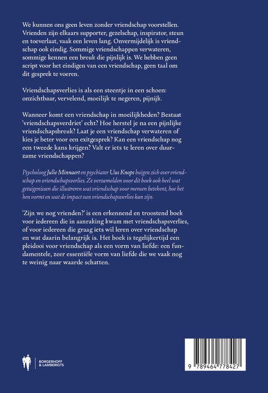 We kunnen ons geen leven zonder vriendschap voorstellen. Sommige vriendschappen blijven stevig aanwezig, een leven lang. Wanneer ons leven zich ontvouwt en elke nieuwe levensfase aanbreekt, zijn vrienden de omringende supporters. Als jobs en relaties komen en gaan, blijven vrienden als een vuurtoren onvoorwaardelijk daar. Sommige vriendschappen zijn dan weer nieuwer: we delen geen verleden samen, maar we zetten samen een stap in de toekomst. Ook die vriendschappen sluiten we in ons hart. Onvermijdelijk is vriendschap ook eindig, en gaan vrienden soms ‘uit elkaar’. Omdat vriendschap zo kernachtig onze identiteit mee vormgeeft, kan zo’n verlies stevig binnenkomen. Een vriendschapseinde kan pijnlijk, begrijpelijk, noodgedwongen, ongewild... zijn. We hebben geen script over hoe vriendschappen eindigen en geen taal om een gesprek te voeren als we een vriendschap willen stopzetten. Vriendschapsverlies is een thema dat velen beroert. We dragen het mee als een steentje in de schoen: onzichtbaar, vervelend, moeilijk te negeren, maar niet hetzelfde als een rotsblok op je borst. Wanneer komt een vriendschap in moeilijkheden? Is er zoiets als ‘vriendschapsverdriet’? Hoe herstel je na een pijnlijke vriendschapsbreuk? Laat je een vriendschap verwateren, of kies je beter voor een ‘exitgesprek’? Kan een vriendschap nog een tweede kans krijgen? En als je vriendschapsverlies hebt meegemaakt, kan het je dan iets leren over hoe je vriendschap in de toekomst kan vasthouden op een duurzame manier? Een erkennend en troostend boek voor iedereen die in aanraking kwam met vriendschapsverlies, of voor iedereen die graag iets wil leren over vriendschap en wat daarin belangrijk is. Het boek is tegelijkertijd een pleidooi voor vriendschap, als een vorm van liefde: een fundamentele, zeer essentiële vorm van liefde die we vaak nog te weinig naar waarde schatten.