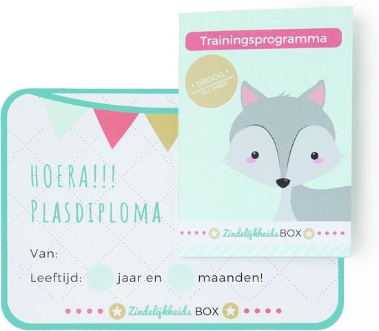 Het trainingsprogrammaboekje bevat instructies en veelgestelde vragen met antwoorden. De instructiekaarten geven je beknopte instructies per dag als herinnering. De complimentkaarten gebruik je als je even door je complimentjes heen bent. En met de zindelijkheidschema’s leer je de momenten kennen waarop jouw kind naar het toilet moet, zodat je de succeskans vergroot. Doe enthousiast en beloon je kind! Met stickerkaarten variërend van drie tot negen vakjes weet je wanneer, en kun je de beloningsfrequentie verlagen op het moment dat jouw kind daaraan toe is. Natuurlijk bevat de box ook vrolijke dierenstickers om te plakken, wanneer je kind een succeservaring heeft.