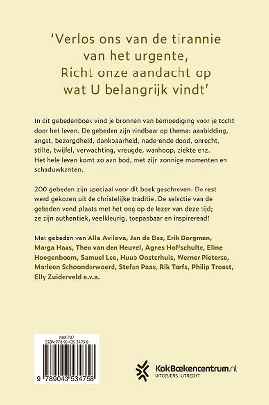 Met gebeden van Alla Avilova, Jan de Bas, Erik Borgman, Marga Haas, Theo van den Heuvel, Agnes Hoffschulte, Eline Hoogenboom, Samuel Lee, Huub Oosterhuis, Werner Pieterse, Marleen Schoonderwoerd, Stefan Paas, Rik Torfs, Philip Troost, Elly Zuiderveld e.v.a.