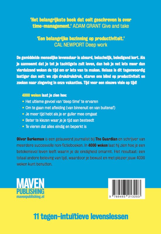 Het boek start met een dubbele binnenkaft met daarin een bolletje voor elke van de 4.000 weken die een mens krijgt. Voor mij als 56-jarige is het confronterend te zien hoeveel weken er al achter me liggen. Een ding is zeker: Op termijn zijn we allemaal dood. Het is dus zaak om goed te kiezen wat je wilt gaan doen met je kostbare tijd. Je zult in elk geval moeten kiezen, want er is nooit genoeg tijd om alles te doen. Vraag je af of elke nieuwe verplichting het waard is om een deel van je tijd aan op te offeren. Geniet ook van ‘niets hoeven’, en accepteer dat je voor alles nou eenmaal de tijd nodig hebt die ervoor staat. Dit boek geeft een aansprekend perspectief op tijd en hoe ermee om te gaan. Toegankelijk geschreven, met onderbouwingen uit wetenschap en filosofie en met aansprekende praktijkvoorbeelden.