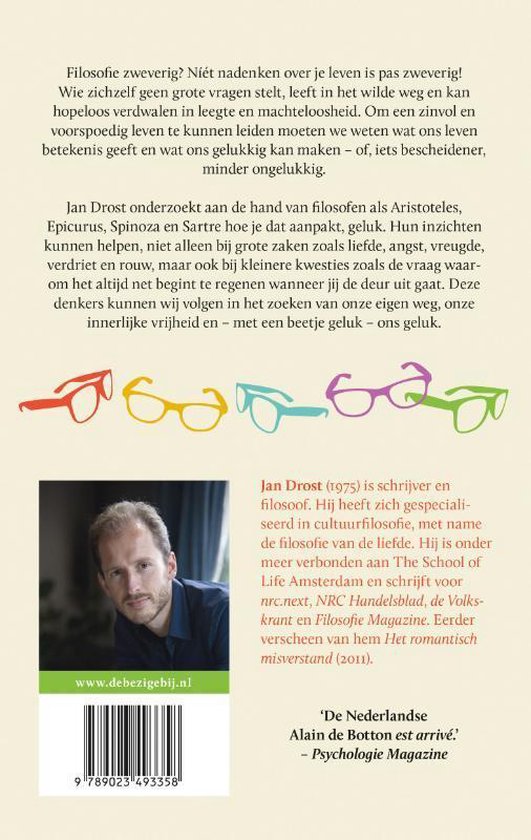Jan Drost onderzoekt aan de hand van filosofen als Aristoteles, Epicurus, Spinoza en Sartre hoe je dat aanpakt, geluk. Hun inzichten kunnen helpen, niet alleen bij grote zaken zoals liefde, angst, vreugde, verdriet en rouw, maar ook bij kleinere kwesties zoals de vraag waarom het altijd net begint te regenen wanneer jij de deur uit gaat. Deze denkers kunnen wij volgen in het zoeken van onze eigen weg, onze innerlijke vrijheid en – met een beetje geluk – ons geluk.