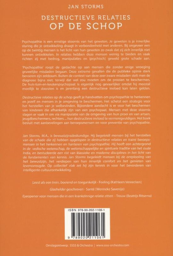 Psychopathie is een ernstige stoornis van het geweten, zo laat Jan Storms in zijn standaardwerk 'Destructieve relaties op de schop' zien. Je geweten is je innerlijke sturing die je ontwikkeling draagt in verbondenheid met anderen. Bij ongeveer 1 op de 20 mensen is het licht van hun geweten zo zwak dat zij zich innerlijk niet kunnen ontwikkelen. Psychopaten zijn erop uit om mensen in hun omgeving kapot te maken. In relaties hebben deze mensen weinig te bieden en vaak richten zij met bedrog, manipulaties en (psychisch) geweld grote schade aan.