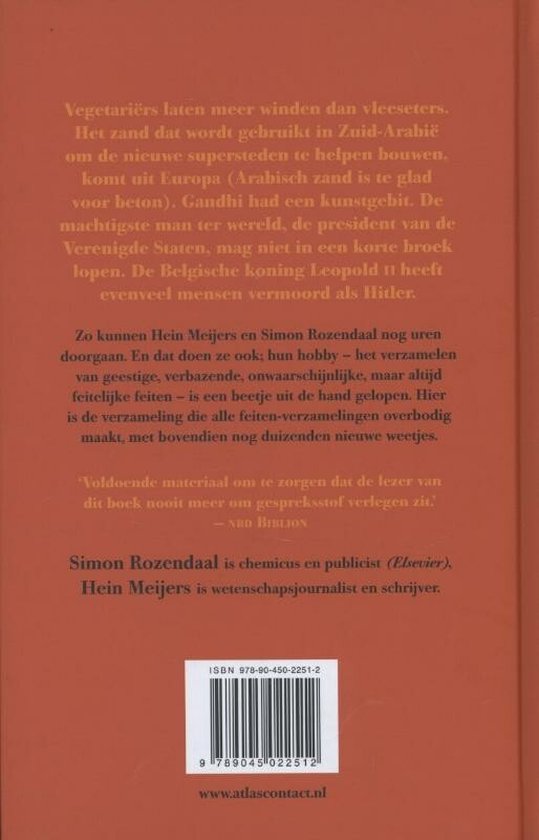 Zo kunnen Hein Meijers en Simon Rozendaal nog uren doorgaan. En dat doen ze ook, hun hobby - het verzamelen van geestige, verbazende, onwaarschijnlijke, nuttige, nutteloze maar altijd feitelijke feiten - is een beetje uit de hand gelopen. Van eerdere edities werden tienduizenden exemplaren verkocht, maar hier is de verzameling die alle feitenverzamelingen overbodig maakt, met bovendien nog duizenden nieuwe weetjes: de Grote Encyclopedie van de Nutteloosheid.