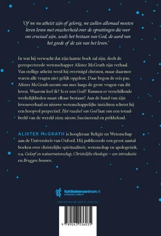 In zijn memoir ‘Het raadsel van God’ kijkt Alister McGrath terug op zijn veelbewogen leven. Van stellige atheïst werd hij overtuigd christen, maar daarmee waren alle natuurwetenschappelijke vragen niet opgelost, integendeel. McGrath laat zien dat het niet irrationeel is wanneer je de mogelijkheid openhoudt dat er een God is of in ieder geval iets dat alles overstijgt. Maar er blijven ook blinde vlekken en zelfs twijfels. Het boek bevat veel persoonlijke anekdotes, maar ook boeiende theologische en filosofische inzichten over de wereld en het heelal.
