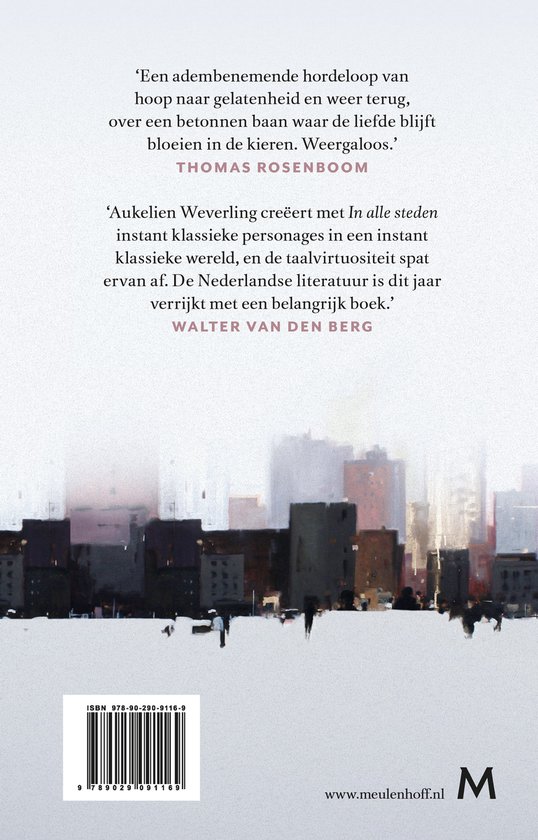 In alle steden is een vrolijke dystopie over een wereld waarin het recht van de sterkste geldt. Met meesterlijke hand schetst Weverling het leven van een man die tegenslag na tegenslag te verwerken krijgt, maar weigert bij de pakken neer te zitten.
