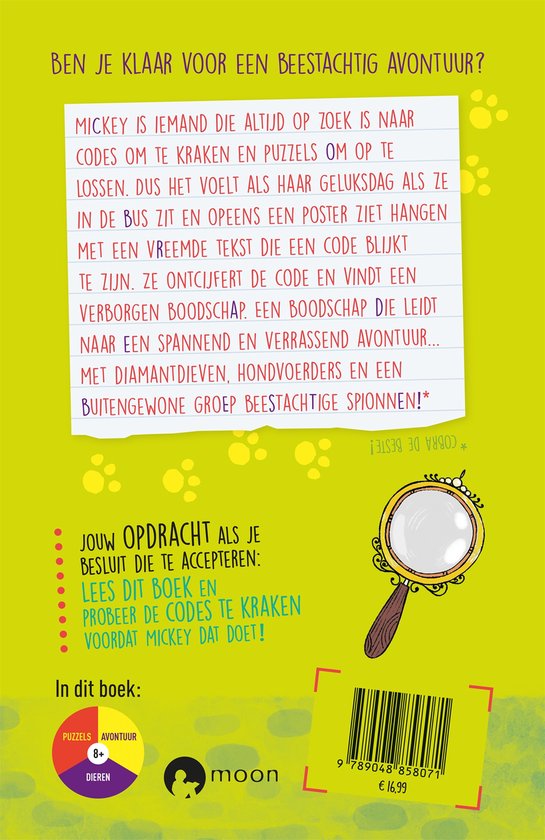 Mickey is iemand die altijd op zoek is naar codes om te kraken en puzzels om op te lossen. Dus het voelt als haar geluksdag als ze in de bus zit en opeens een poster ziet hangen met een vreemde tekst die een code blijkt te zijn. Ze ontcijfert de code en vindt een verborgen boodschap. Een boodschap die leidt naar een spannend en verrassend avontuur... Een avontuur met diamantdieven, hondvoerders en een buitengewone groep beestachtige spionnen!