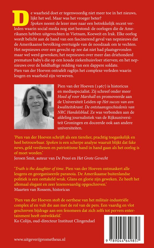 ‘Pien van der Hoeven schrijft als een tierelier, prachtig toegankelijk en heel betrouwbaar. Spoken is een scherpe analyse waaruit blijkt dat fake news, geld verdienen en patriottisme hand in hand gaan als het oorlog is of moet worden.’ Jeroen Smit, auteur van De Prooi en Het Grote Gevecht