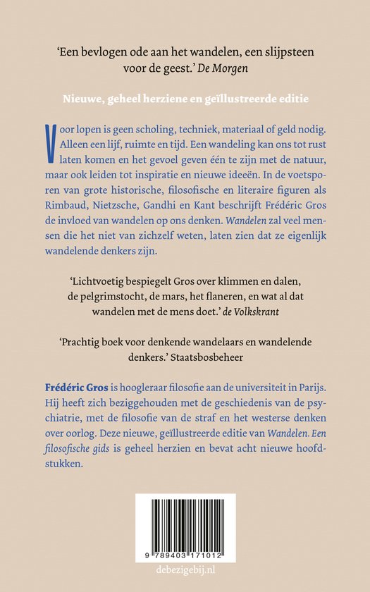 De kunst van het wandelen en zijn veelzijdige effecten wordt beschreven in 25 eenvoudige, heldere essays over wandelende denkers als Nietsche, Rousseau, Kant, Rimbaud, Baudelaire, Wordsworth, Thoreau, Emerson, Gandhi en Gros zelf. De filosoof van le quotidien, is transparant en boeiend, vraagt zich af waar deze denkers wandelen, hoe en waarom ze wandelen, hoeveel uur ze wandelen en of er een relatie bestaat tussen hun denken en hun wandelstijl. Zoals schrijven best de getuigenis is van een stille, levendige ervaring, zo wil dit uit ervaring geboren boek je doorsturen naar die ervaring.