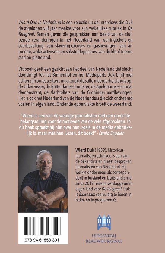 Wierd Duk in Nederland is een selectie uit de interviews die Duk de afgelopen vijf jaar maakte voor zijn wekelijkse rubriek in De Telegraaf. Samen geven die gesprekken een beeld van de sluipende veranderingen in het Nederland van woningtekort en overbevolking, van slavernij-excuses en gasbevingen, van armoede, woke-activisme en stikstofdeposities, van de kloof tussen stad en platteland.