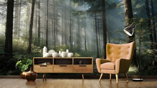 Fotobehang - Uitzicht op de Waterval in het Herfstbos door het Raam 3D - Vliesbehang - 254 x 184 cm