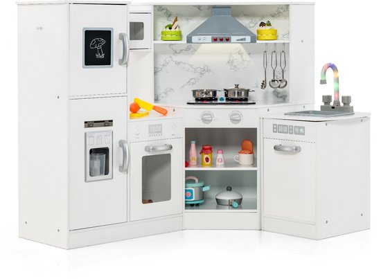 COSTWAY Houten kinderkeuken met wasmachine, gootsteen, waterdispenser, magnetron, oven, gebruiksvoorwerpen, speelkeuken met licht en geluid, voor kinderen vanaf 3 jaar