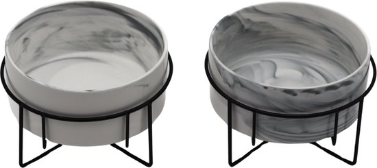 Milo&Den® Luxueuze Marmeren Voer- En Drinkbakken – Marmer - Voor Hond / Kat - Ø 15 cm - Set van 2 - Honden voerbak - Drinkbakken voor dieren - Dubbele voerbak - Wit/Zwart