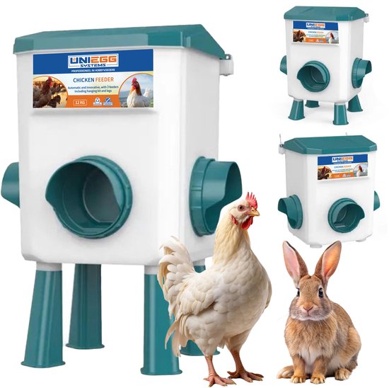 UniEgg® XL Feeder - 12 KG (Groen) - automatisch en innovatief 3 feeders, inclusief ophangset en poten - voerbak kip en ander pluimvee of gevogelte