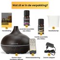 Wat er wordt meegeleverd als je dit product bestelt. - 1x Aroma Diffuser – Donkere houtlook (550ML) 1x Afstandsbediening 1x Maatbeker 1x Zwarte adapter 1x Handleiding (NL) 2x Etherische oliën (Lavendel & Vanille, 10ML per stuk) 14x Extra etherische oliën (10ML per stuk)