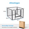 De 4 panelen zijn even groot en kunnen gemakkelijk samengevouwen worden. Na gebruik haal je de pinnen uit de aansluitingen en kun je de kennel in een handomdraai samenvouwen.