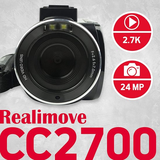 De Realimove CC2700-camcorder zorgt voor een goed gebruikscomfort om de momenten van het leven in 2,7K te filmen. Het heeft een ergonomische handgreep en een 3''-touchscreen en een scharnierend LCD-scherm om in de gaten te houden wat u opneemt. Met de CC2700 maak je ook hele mooie foto's in 24MP.