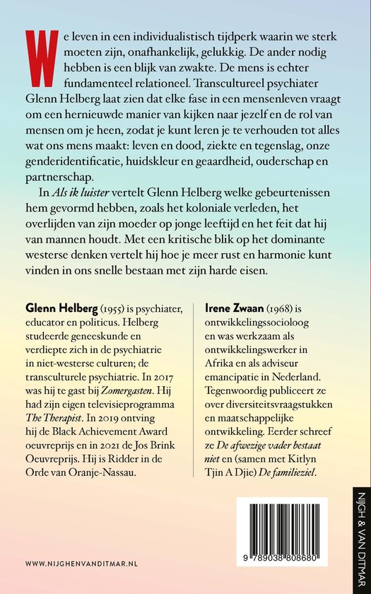 In Als ik luister vertelt Glenn Helberg welke gebeurtenissen hem gevormd hebben, zoals het koloniale verleden, het overlijden van zijn moeder op jonge leeftijd en het feit dat hij van mannen houdt. Met een kritische blik op het dominante westerse denken vertelt hij hoe je meer rust en harmonie kunt vinden in ons snelle bestaan met zijn harde eisen.