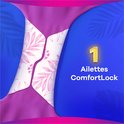 - Maandverband met ComfortLock vleugels, ontworpen voor een betere pasvorm dat past in elk soort ondergoed (vs. vorig product)