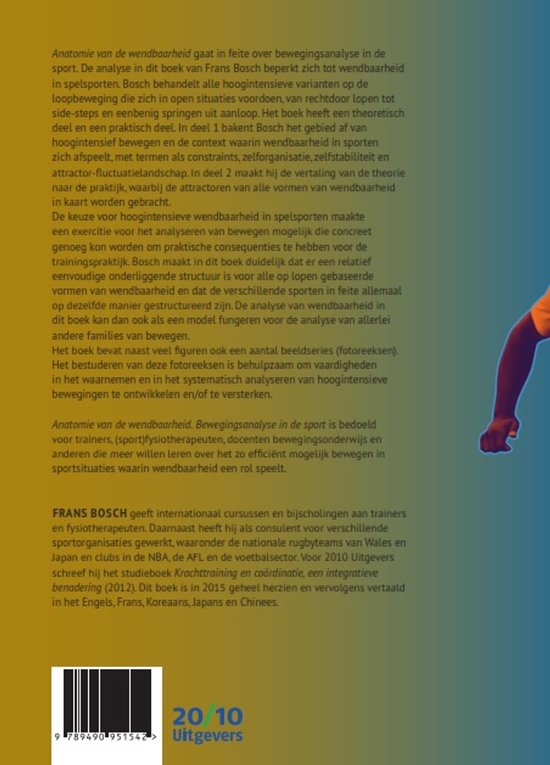 Anatomie van de wendbaarheid gaat in feite over bewegingsanalyse in de sport. De analyse in dit boek van Frans Bosch beperkt zich tot wendbaarheid in spelsporten. Bosch behandelt alle hoogintensieve varianten op de loopbeweging die zich in open situaties voordoen, van rechtdoor lopen tot side-steps, tot eenbenig springen uit aanloop. Het boek heeft een theoretisch deel en een praktisch deel. In deel 1 bakent Bosch het gebied af van hoogintensief bewegen en de context waarin wendbaarheid in sporten zich afspeelt, met termen als constraints, zelforganisatie, zelfstabiliteit en attractor-fluctuatielandschap. In deel 2 maakt hij de vertaling van de theorie naar de praktijk, waarbij de attractoren van alle vormen van wendbaarheid in kaart worden gebracht. De keuze voor hoogintensieve wendbaarheid in spelsporten maakte een exercitie voor het analyseren van bewegen mogelijk die concreet genoeg kon worden om praktische consequenties te hebben voor de trainingspraktijk. Bosch maakt in dit boek duidelijk dat er een relatief eenvoudige onderliggende structuur is voor alle op lopen gebaseerde vormen van wendbaarheid en dat de verschillende sporten in feite allemaal op dezelfde manier gestructureerd zijn. De analyse van wendbaarheid in dit boek kan ook als een model fungeren voor de analyse van allerlei andere families van bewegen. Het boek bevat naast veel figuren ook een aantal beeldseries (fotoreeksen). Het bestuderen van deze fotoreeksen is behulpzaam om vaardigheden in het waarnemen en in het systematisch analyseren van hoogintensieve bewegingen te ontwikkelen en/of te versterken. Anatomie van de wendbaarheid. Bewegingsanalyse in de sport is bedoeld voor trainers, (sport)fysiotherapeuten, docenten bewegingsonderwijs en anderen die meer willen leren over het zo efficiƫnt mogelijk bewegen in sportsituaties waarin wendbaarheid een rol speelt. Frans Bosch geeft internationaal cursussen en bijscholingen aan trainers en fysiotherapeuten. Daarnaast heeft hij als consulent voor verschillende sportorganisaties gewerkt, waaronder de nationale rugbyteams van Wales en Japan en clubs in de NBA, de AFL en de voetbalsector. Voor 2010 Uitgevers schreef hij het studieboek Krachttraining en coƶrdinatie, een integratieve benadering (2012). Dit boek is in 2015 geheel herzien en vervolgens vertaald in het Engels, Frans, Koreaans, Japans en Chinees.