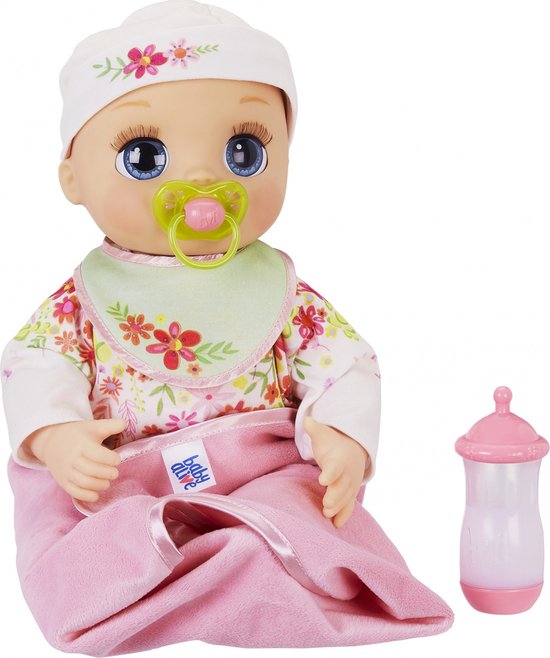 Als de baby onrustige geluiden maakt doe je het slabbetje om en geef je de fles. Ze maakt drink- en slurpgeluidjes. Klop haar daarna op haar rug om een boergeluidje te horen. Na het spelen kan ze een dutje doen. Als het tijd is om te slapen wikkel je haar in een mooie bijpassende deken. Luister naar haar schattige slaapgeluidjes wanneer ze indut. Kleine papa's en mama's zullen zoveel plezier hebben van de Baby Alive Levensechte Baby interactieve babypop!