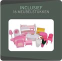 - 16-delige meubelset: Compleet met meubels voor de keuken, woonkamer, badkamer en slaapkamer