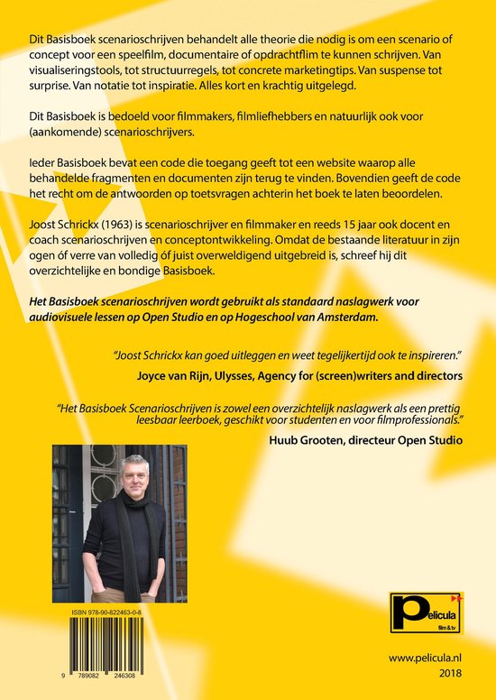 Joost Schrickx maakt documentaires en schrijft scenario's voor fictiefilms en opdrachtfilms. Al meer dan 15 jaar geeft hij ook les in en treedt hij als coach op bij het scenarioschrijven voor fictie, documentaire en opdrachtfilm. Zijn jarenlange ervaring als docent en coach en het lesmateriaal dat hij daarbij in de loop der jaren ontwikkeld heeft, heeft hij verwerkt tot het overzichtelijke Basisboek Scenarioschrijven, dat tegelijkertijd een naslagwerk en een leerboek is. Dit Basisboek scenarioschrijven behandelt alle theorie die nodig is om een scenario of concept voor een speelfilm, documentaire of opdrachtflim te kunnen schrijven. Van visualiseringstools, tot structuurregels, tot concrete marketingtips. Van suspense tot surprise. Van notatie tot inspiratie. Alles kort en krachtig uitgelegd. Dit Basisboek is bedoeld voor filmmakers, filmliefhebbers en natuurlijk ook voor (aankomende) scenarioschrijvers. Ieder Basisboek bevat een code die toegang geeft tot een website waarop alle behandelde fragmenten en documenten zijn terug te vinden. Bovendien geeft de code het recht om de antwoorden op toetsvragen achterin het boek te laten beoordelen. Joost Schrickx (1963) is scenarioschrijver en filmmaker en reeds 15 jaar ook docent en coach scenarioschrijven en conceptontwikkeling. Omdat de bestaande literatuur in zijn ogen óf verre van volledig óf juist overweldigend uitgebreid is, schreef hij dit overzichtelijke en bondige Basisboek. "Joost Schrickx kan goed uitleggen en weet tegelijkertijd ook te inspireren." Joyce van Rijn, Ulysses, Agency for (screen)writers and directors "Het Basisboek Scenarioschrijven is zowel een overzichtelijk naslagwerk als een prettig leesbaar leerboek, geschikt voor studenten en voor filmprofessionals." Huub Grooten, directeur Open Studio