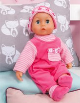 Interactive Baby (40cm) is een pop om verzot op te raken. Deze schattige babypop brabbelt, lacht of huilt (in totaal 12 babygeluidjes) als je tegen haar buik drukt. De pop is gemodelleerd met veel aandacht voor detail en heeft schattige krullen. Doordat haar lichaam zo zacht aanvoelt, vraagt ze erom te worden geknuffeld en gekoesterd. Met haar schattige outfit met bijpassende muts is ze altijd perfect gezelschap voor een bezoekje aan een vriendin of aan de speeltuin, of gewoon voor thuis.