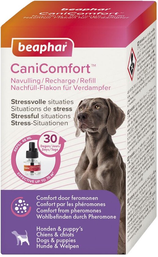 Het feromoon in Beaphar CaniComfort® is een klinisch bewezen, eenvoudige en effectieve oplossing om ongewenst gedrag te helpen voorkomen en honden te kalmeren. Beaphar CaniComfort® helpt de hond om zich op zijn gemak te voelen, doordat hij de kopie van de feromonen in dit product herkent. Dit feromoon wordt van nature geproduceerd door de teef als ze haar puppy’s voedt en is van cruciaal belang voor het bindingsproces. Door een kopie van dit feromoon in Beaphar CaniComfort® te gebruiken, heeft het een rustgevende werking en laat het zowel pups als volwassen honden weten wat een veilige plek is. Hierdoor worden gedragsproblemen verminderd, zoals blaffen, vernielen van meubels, markeringsgedrag, overmatig likken en krabben, verstoppen of angst. Beaphar CaniComfort® is zeer geschikt wanneer honden nieuwe ervaringen opdoen, zoals bij trainingen, introductie in een onbekende omgeving zoals een nieuw huis, gezins-uitbreiding (dier of mens) of andere stressvolle situaties zoals onweer, vuurwerk en harde geluiden. Overmatige stress bij honden kan leiden tot klinische ziekten. Beaphar CaniComfort® is geschikt voor honden van alle leeftijden en rassen. Het heeft geen invloed op andere diersoorten in het huishouden en versuft honden niet. Dit product kan gebruikt worden naast eventuele medicijnen. De verdamper moet worden geplaatst in de kamer waar de hond het grootste deel van zijn tijd doorbrengt. Gebruik de verdamper continu, niet uitschakelen. Vervang de vulling na 30 dagen met een nieuwe Beaphar CaniComfort® navulling.