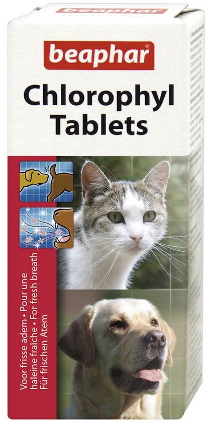 Gebruiksaanwijzing * Kleine honden en katten (tot 10kg) ½ tablet ’s ochtends en ‘s avonds. * middelgrote honden (10-20kg) 1 tablet ’s ochtends en ‘s avonds. * grote honden (vanaf 20kg) 3-4 tabletten per dag.Er moet altijd vers drinkwater aanwezig zijn.Samenstelling Chlorophyl 9600 mg/kg, suiker, melk en -bijproducten.Analytische BestanddelenRuw eiwit 1,1%, ruw vet 0,77%, ruwe celstof 0,0%, ruwe as 0,79%, vocht 0,67%, calcium 0,19%, fosfor 0,044%, natrium 0,05%, magnesium 0,0087%, potassium 0,15%.Inhoud30 tabletten.