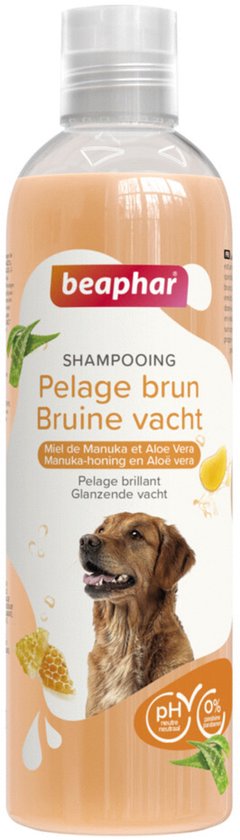 De Beaphar Shampoo Bruine Vacht 250 ml is een milde, pH-neutrale hondenshampoo speciaal voor honden met een licht- tot donkerbruine vacht. De shampoo is verrijkt met Manuka-honing en Aloë Vera en zorgt hierdoor voor een zachte en glanzende vacht. Ook draagt het bij aan het behoud van de natuurlijke bruine kleur en laat het een frisse en aangename geur na. De shampoo is vrij van parabenen, siliconen en kleurstoffen.