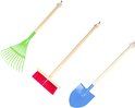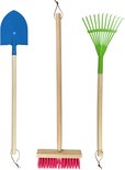 Tuingereedschap set 3-delig voor kinderen. Een complete tuinieren startset in vrolijke kleuren voor kinderen, bestaande uit: een blauwe schop/schep, groene bladhark en een rode bezem waarmee uw kind kan helpen in de tuin. Tuinieren is erg leerzaam: onderhoud bijvoorbeeld samen een klein moestuintje! Afm. schep: 14 x 17 x 71 cm. Afm. bezem: 20 x 5 x 72 cm. Afm. bladhark: 21 x 21 x 89 cm.